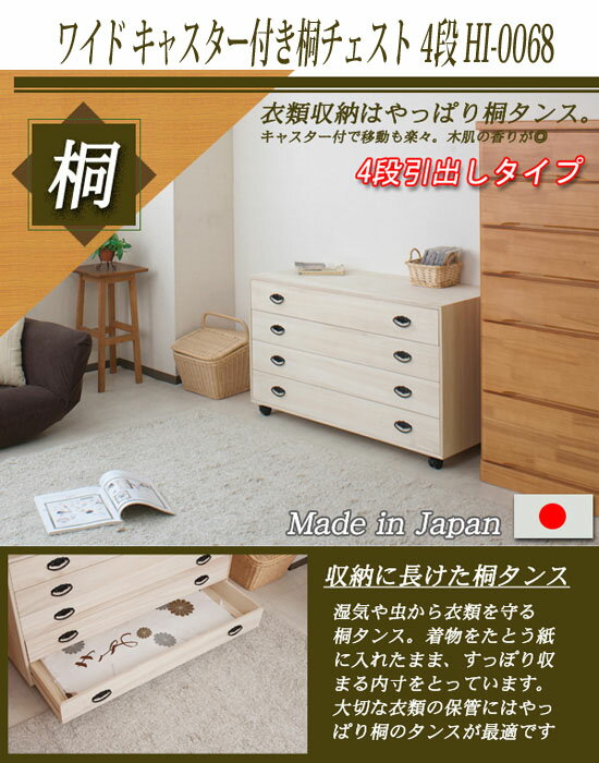 桐チェスト 4段 キャスター付き桐衣装箪笥 特徴 キャスター付き桐チェスト 4段 桐たんす ワイド HI-0068 ■クローゼットにも入る総桐チェスト。