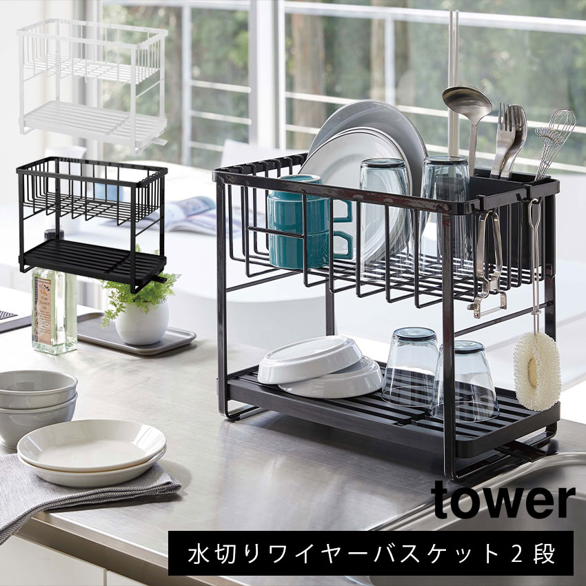 水切りかご 水切りラック tower 山崎実業 yamazaki キッチン おしゃれ ドレーナー ディッシュドレーナー モノトーンインテリア キッチンツール 白 黒 ホワイトインテリア シンプル 北欧 モノトーン 雑貨 台所 neore / ツーウェイ水切りワイヤーバスケット2段 タワー